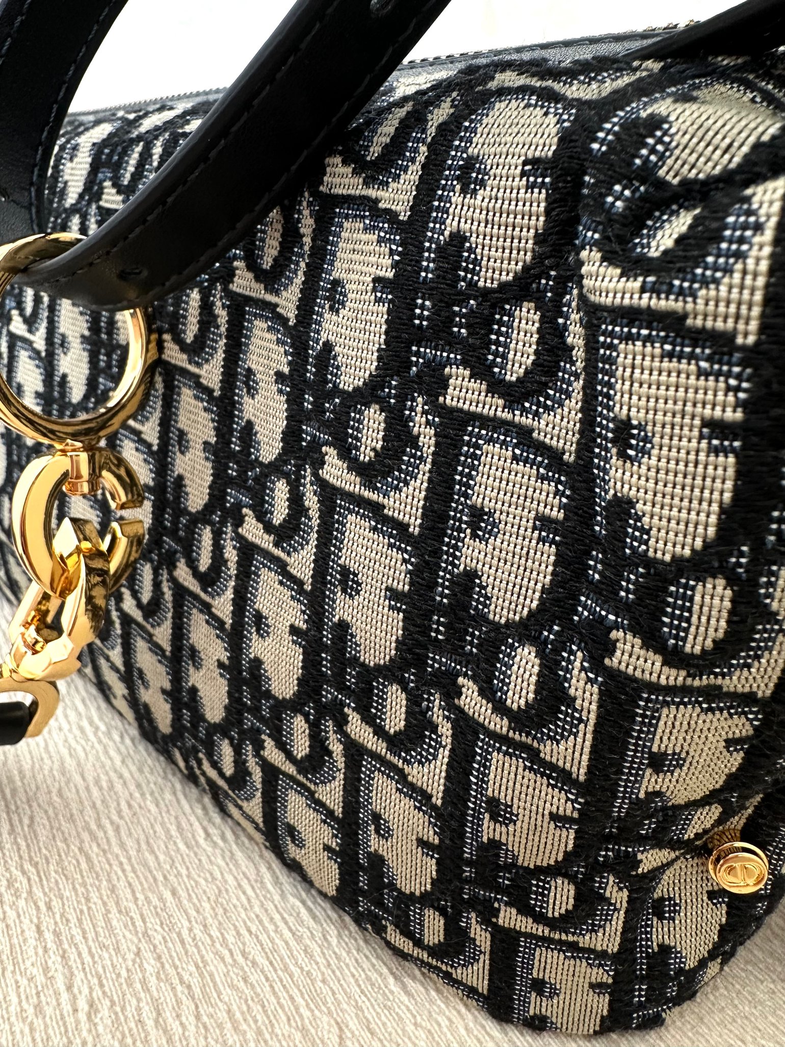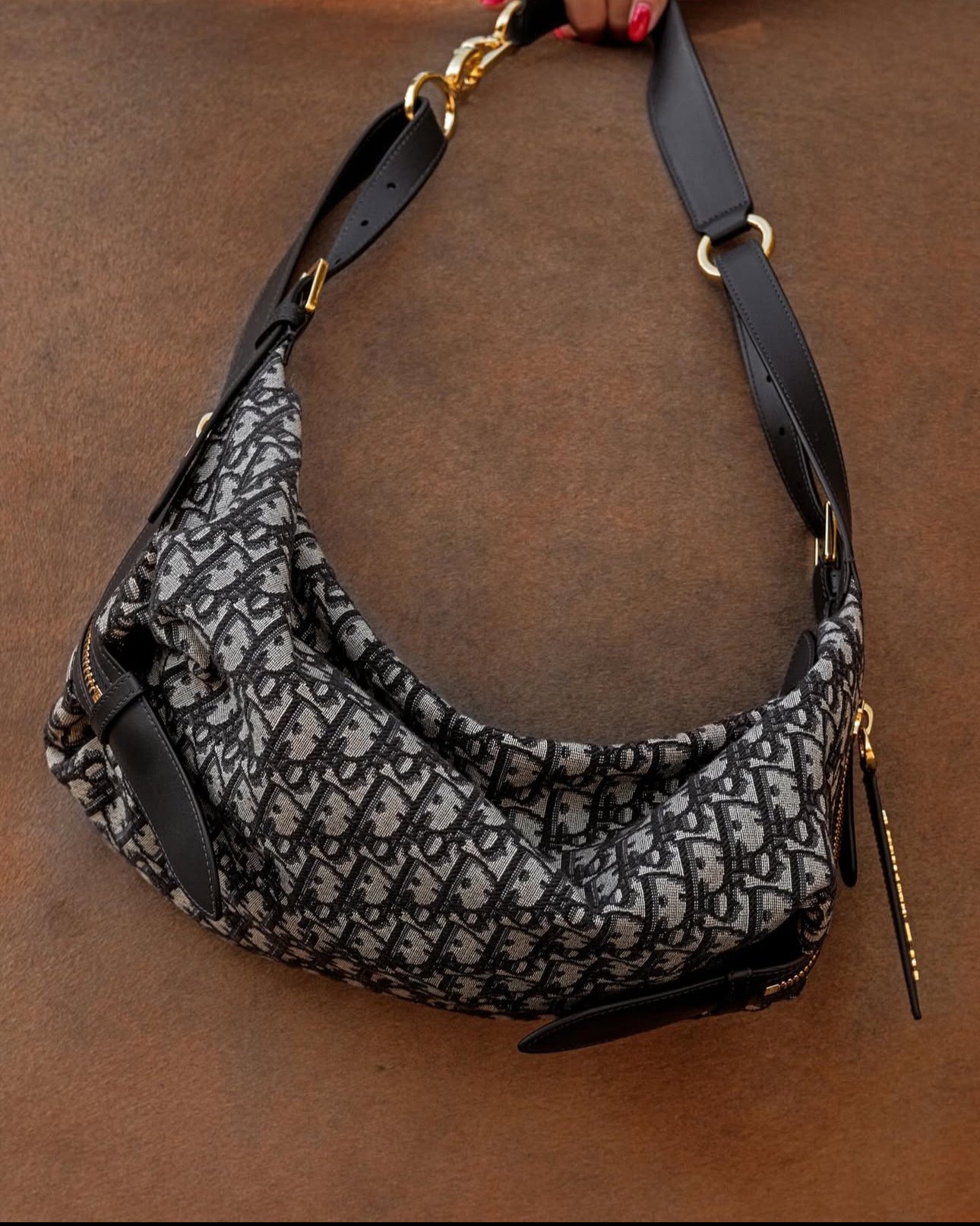 Las asas superiores ajustables y la bandolera de piel.