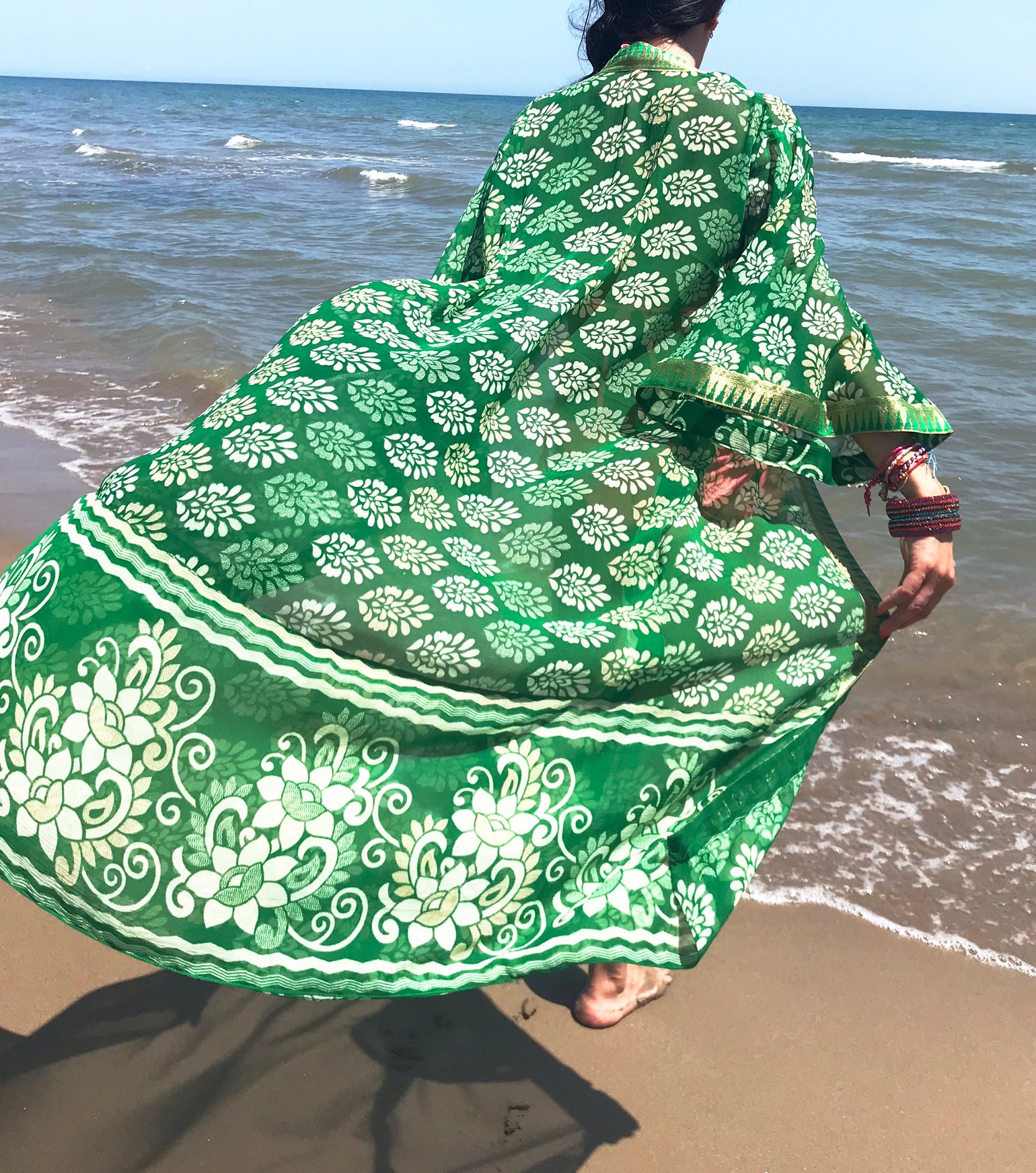 Abertura frontal en un fabuloso Chiffon de colores brillantes en verdes.