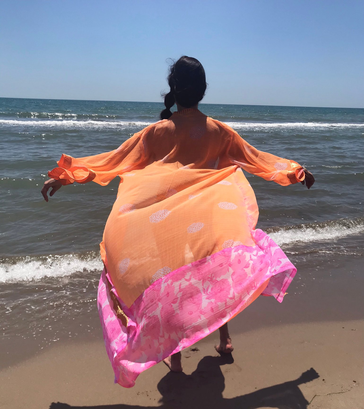 Abertura frontal en un fabuloso Chiffon de colores brillantes en tonos rosas y anaranjados.