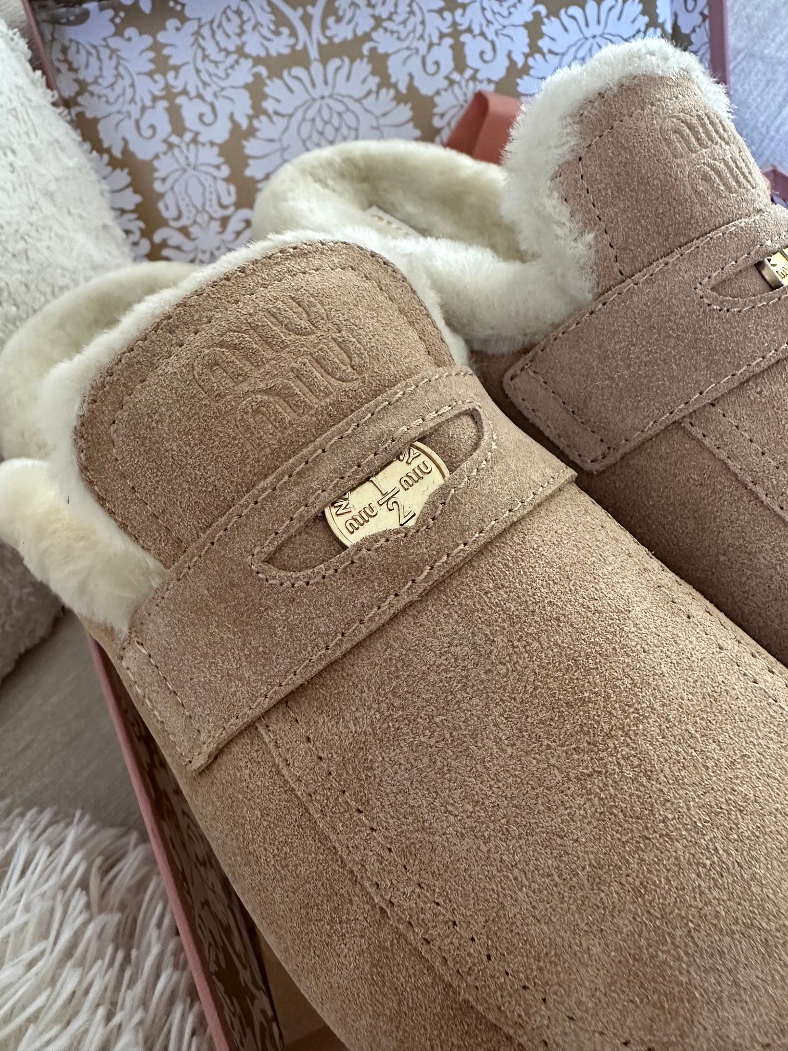 Mules en ante Beige clarito , empeine con banda de piel y moneda de metal con logo grabado